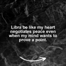 Motivational Libra zodiac meme: Libra be like my heart negotiates peace even when my mind wants to prove a point. Share your Libra energy on ZodiacMemes.com.